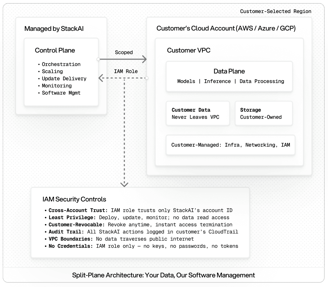 For organizations that require full control over their cloud infrastructure, StackAI deploys within a customer-owned VPC — the Private Cloud, or Bring Your Own Cloud (BYOC), model. StackAI manages the software remotely via a scoped cross-account IAM role; the customer manages infrastructure, networking, and IAM. User accounts from StackAI will be enabled for deployment, then can be disabled until needed. Because your data never leaves your cloud, you have the highest level of data sovereignty without the constraints of an air-gapped environment. Organizations requiring no vendor access can choose the non-IAM mode, where StackAI only provides advisory support.