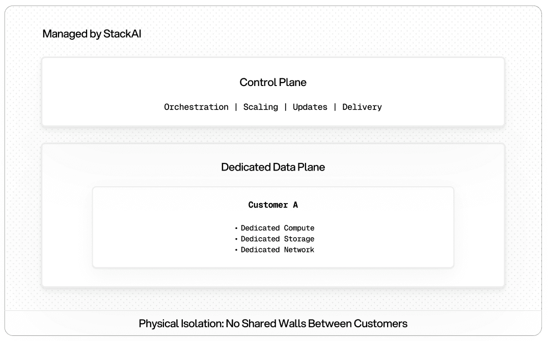 For organizations that require dedicated infrastructure but do not want to manage it themselves, StackAI offers a fully managed Dedicated Cloud deployment. StackAI provisions and operates a dedicated VPC exclusively for one customer. No other organization shares this infrastructure.