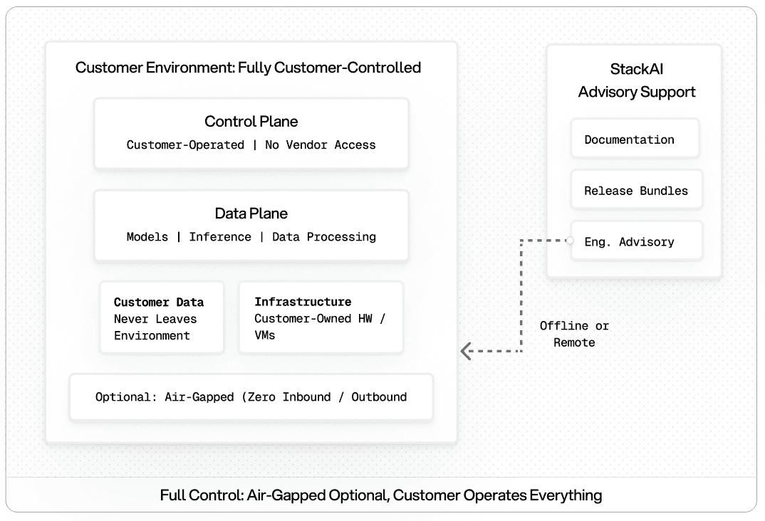 For organizations that require full operational control, StackAI deploys entirely within the customer's environment — physical data center or isolated cloud account. The customer owns and operates everything: infrastructure, control plane, and data plane. StackAI provides documentation, signed release bundles, and advisory support.