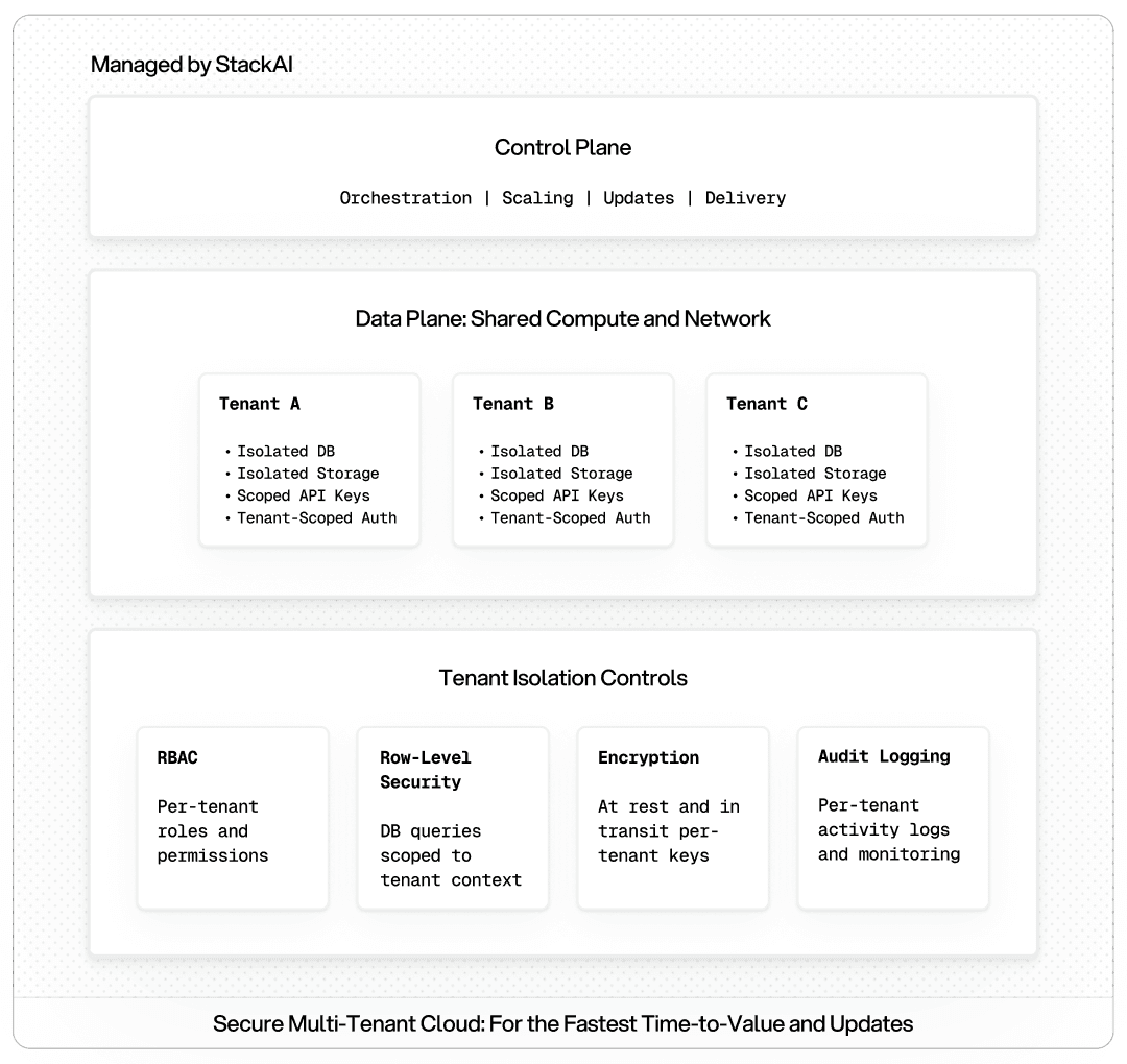 The Multi-Tenant Cloud model is StackAI's standard offering and the fastest way for organizations to get started. In this configuration, multiple organizations share the same cloud infrastructure. Each organization's data is logically separated within the shared environment using tenant-level isolation at the database layer. This model is appropriate for the vast majority of organizations and is suitable for teams that want immediate access to StackAI with no infrastructure overhead.