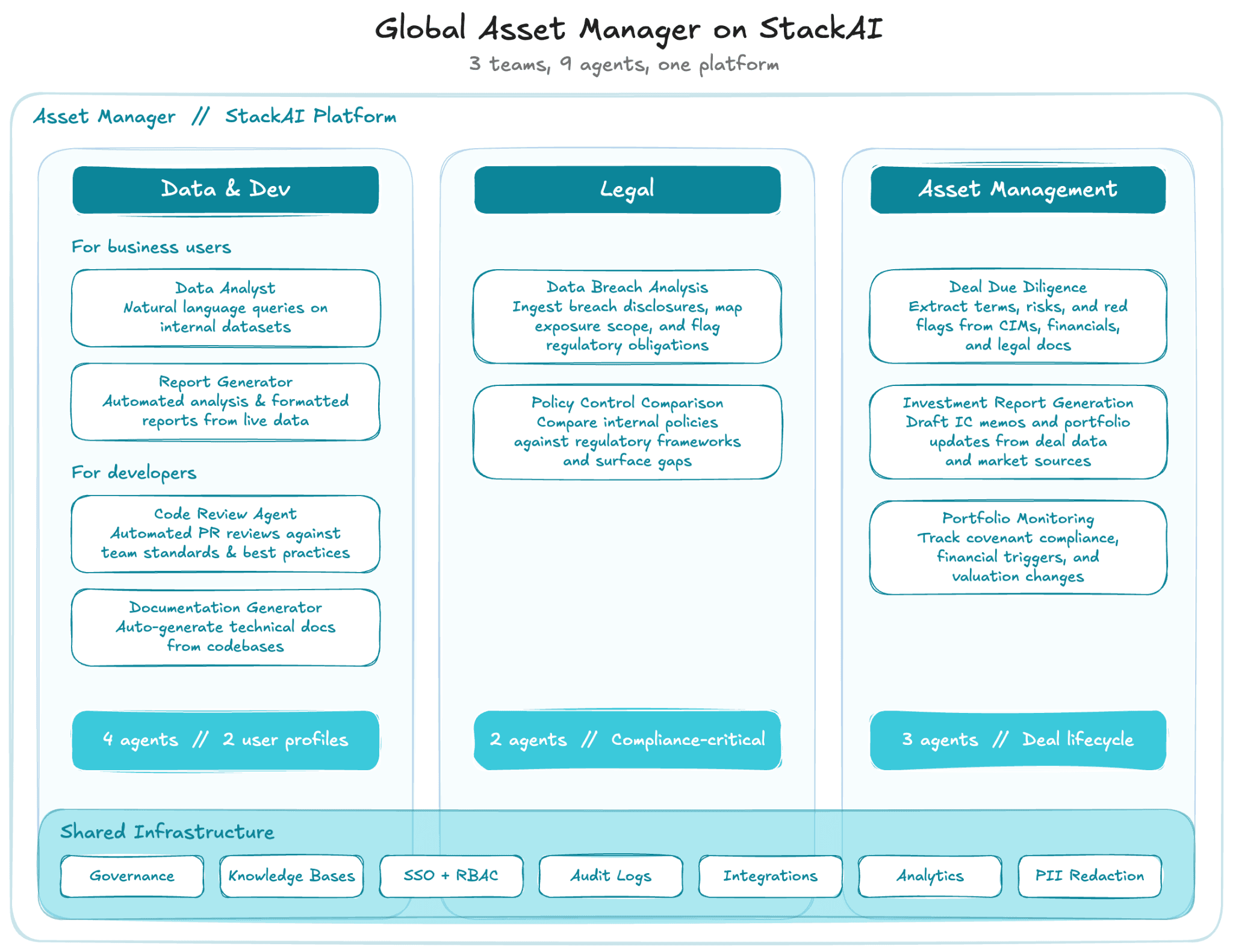 On a single-tool platform, each new team means a new vendor, a new security review, and knowledge that stays siloed. On StackAI, the second deployment costs a fraction of the first, the infrastructure, governance, and integrations are already there, and what finance built can directly inform what ops or legal builds next. The investment compounds.