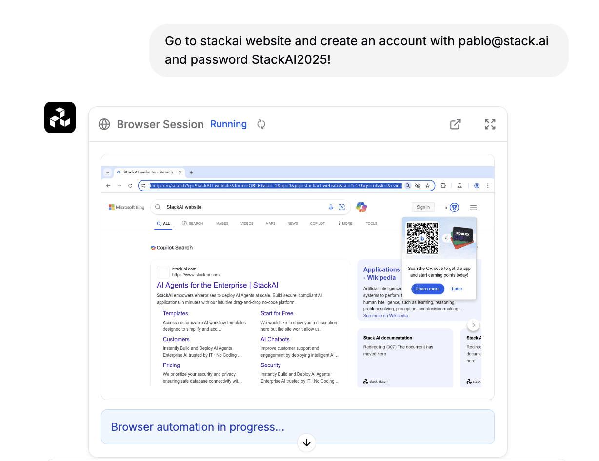 StackAI is built for this. The StackAI Terminal gives the AI Agent an actual sandbox to perform complex document analysis, write code or generate precise visuals. The Code Node allows deterministic logic to run inside any workflow. Interfaces can be tailored, chat, form, Slack bot, widgets embedded in your website, depending on who the end user is. And with 100+ integrations covering Salesforce, Workday, SAP, ServiceNow, Snowflake, Slack, and more, the agent doesn't just produce an output, it streamlines or supercharges the process.