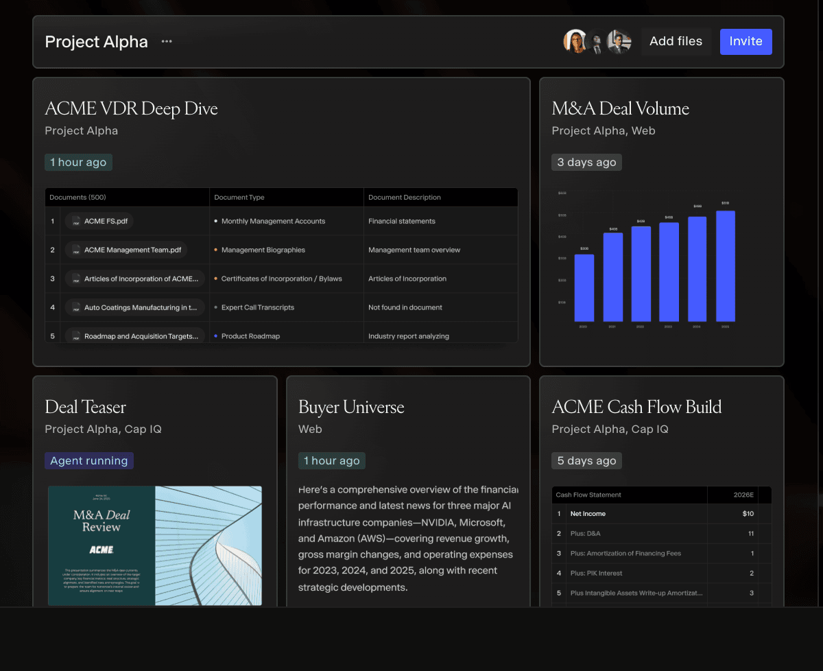 Projects. Hebbia's latest major product release is Projects. This includes always-on background agents (in beta) that monitor for new documents and market signals, a real-time activity feed so anyone joining mid-deal has full context, and the ability to generate client-ready deliverables directly from accumulated analysis. It's a meaningful step from individual analyst productivity toward team-level coordination.