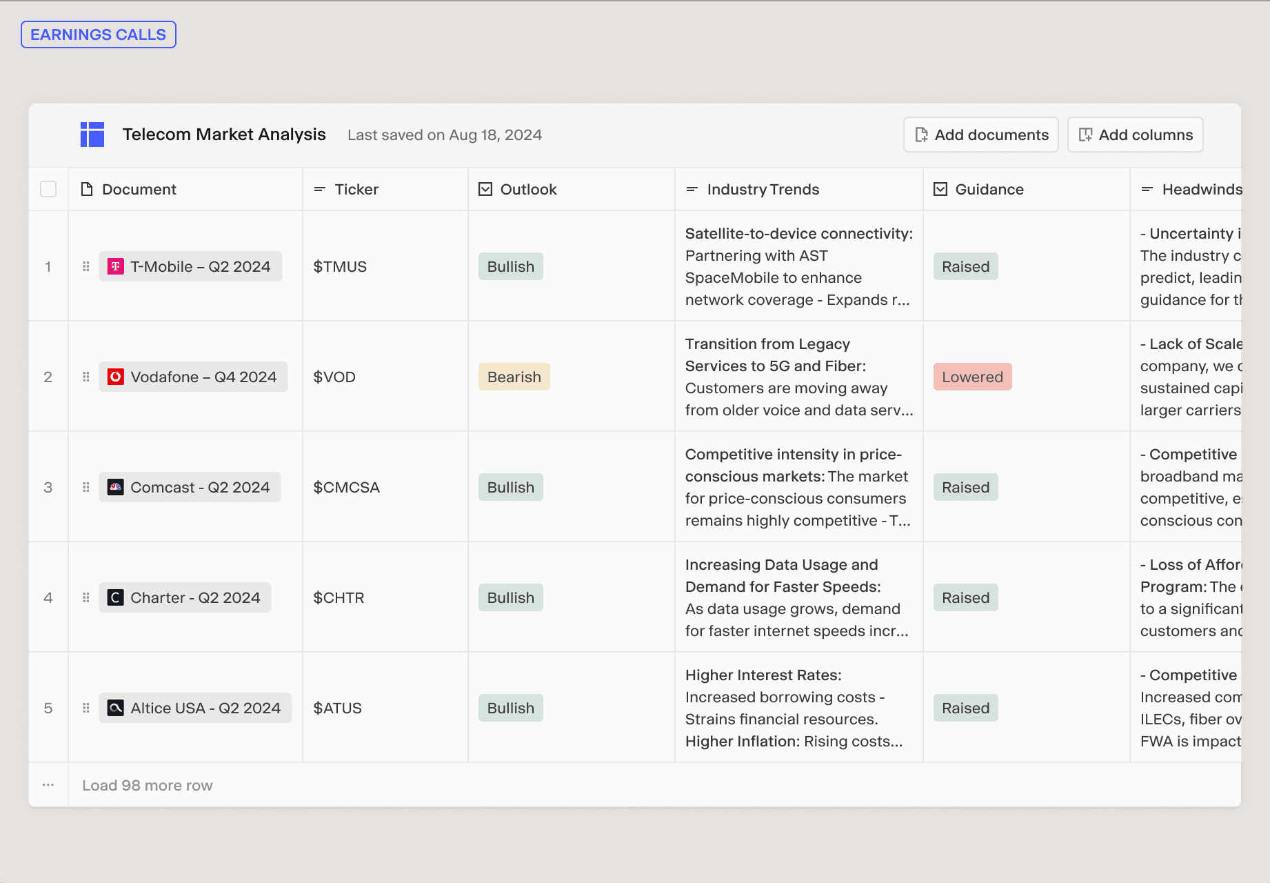 The Matrix interface. Instead of chatting with documents one at a time, Matrix presents AI as a spreadsheet, rows are documents, columns are prompts. An analyst can ask "Extract the EBITDA definition" across 500 credit agreements simultaneously and see every answer in a structured grid. It's a genuinely different interaction model for batch analysis.
