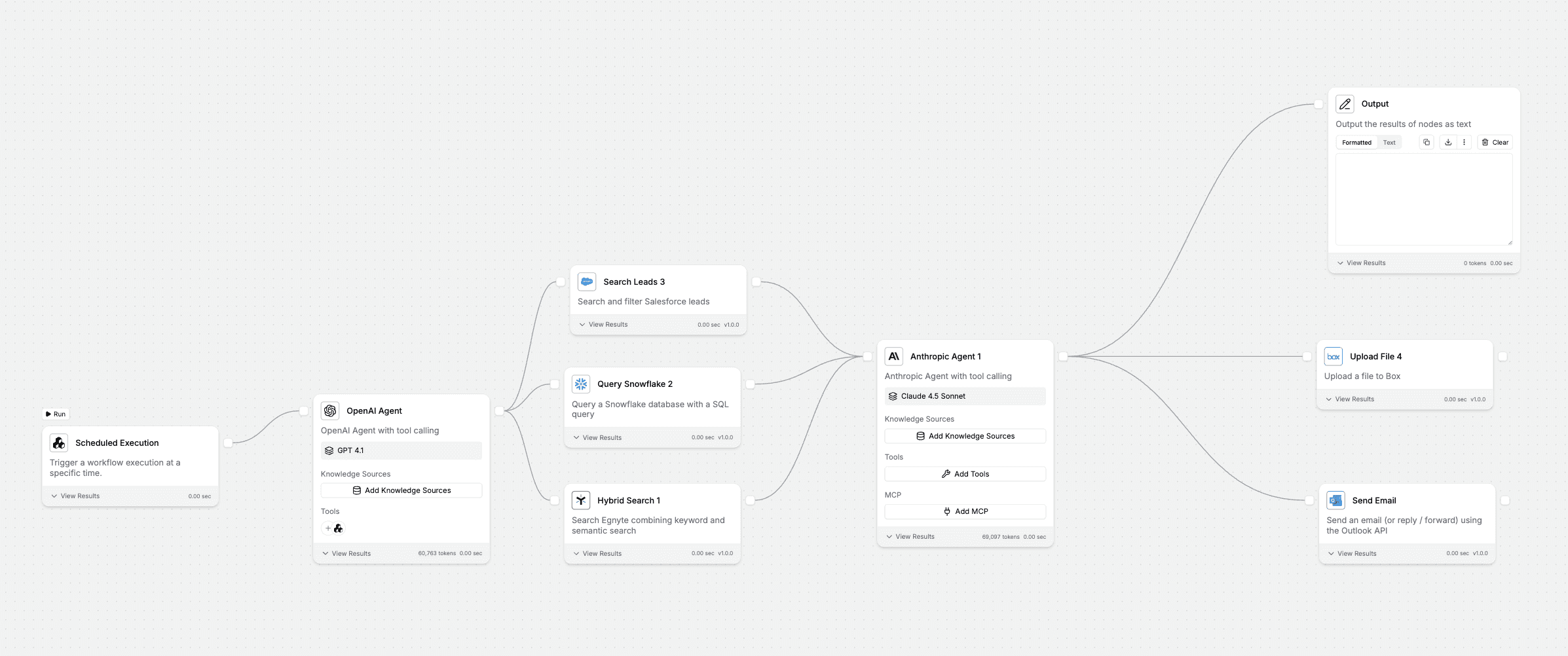 Real-world pattern: A hedge fund automated their daily equity research briefing. The workflow pulls the latest analyst reports from Box, synthesizes key takeaways, and delivers a formatted email to portfolio managers every morning before market open.