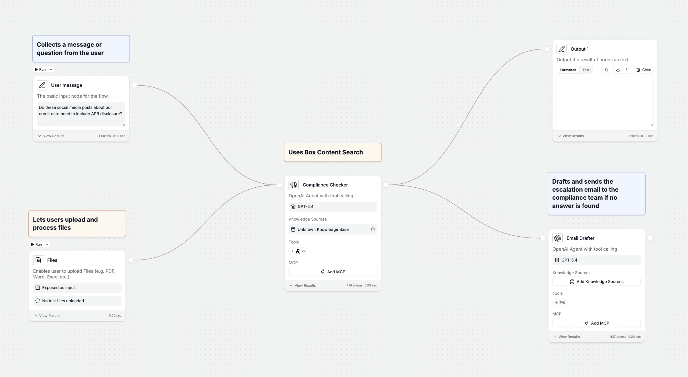 Real-world pattern: A venture capital firm deployed a three-tier compliance system: a first-line chatbot for instant employee queries, a second-line investigation tool for compliance officers, and a third-line report generator for audit-ready summaries, all drawing from Box.