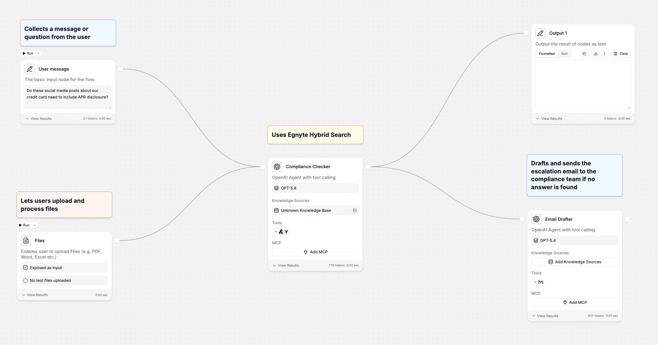 Deploy a Compliance Chatbot that uses Hybrid Search to find relevant policy documents in Egnyte and Ask Document Question to extract precise, cited answers. How it works: