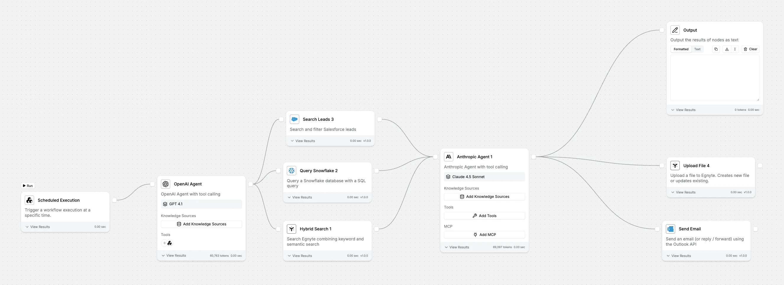 Real-world pattern: A financial services firm automated their daily equity research email — the workflow pulls the latest analyst reports from their content management system, synthesizes key insights, and distributes a formatted briefing to portfolio managers every morning before market open.
