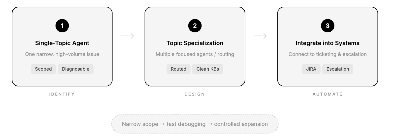 The initial instinct is often to build a universal support agent covering every single topic. But in reality, teams that succeed do the opposite.
