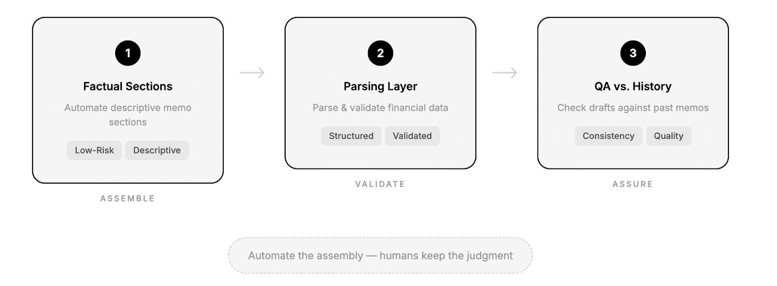 Rather than generating memos end-to-end, mature deployments add a QA layer. Drafts are compared against previously approved memos to flag missing sections, structural inconsistencies, or deviations from standard methodology. The system improves consistency, not just speed.