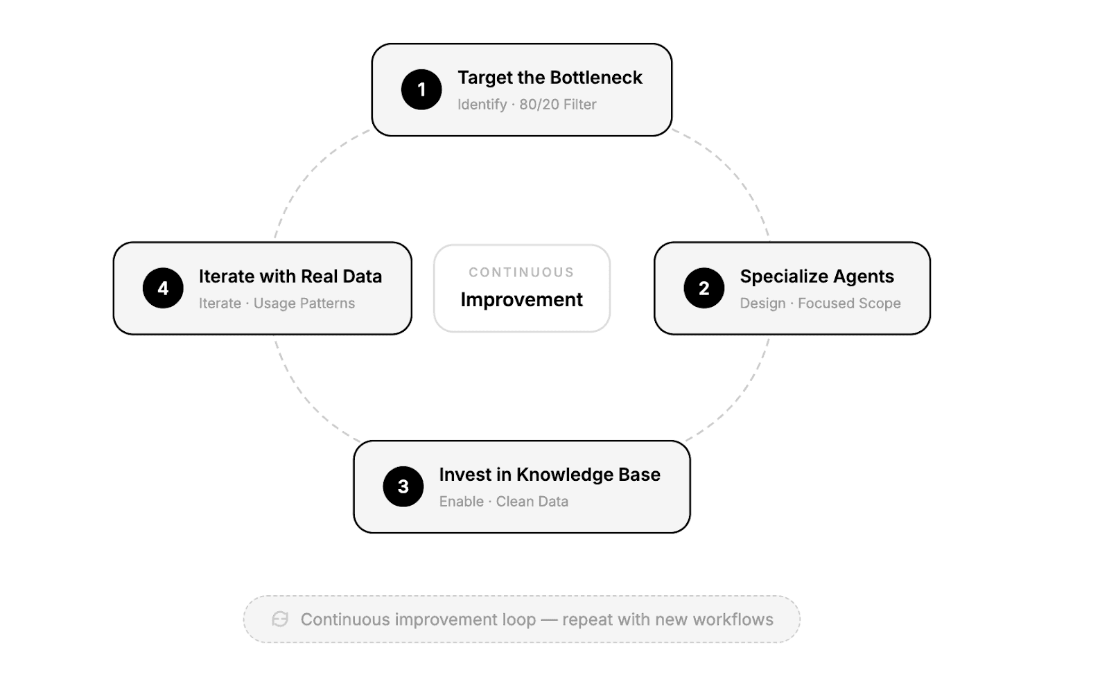 Invest disproportionately in knowledge base quality. The most common source of AI failures in enterprise settings isn’t the model, but the data. Clean, well-structured documentation is the single highest-leverage investment you can make.