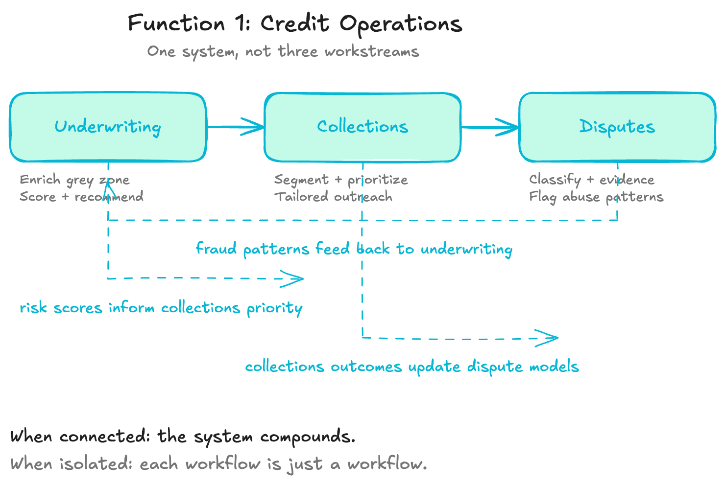 Most BNPL teams use AI in fragments: one workflow here, a copilot there, vertical AI platforms or SaaS everywhere. The result? Isolated gains across silos with no shared data, no feedback loops, no compounding.