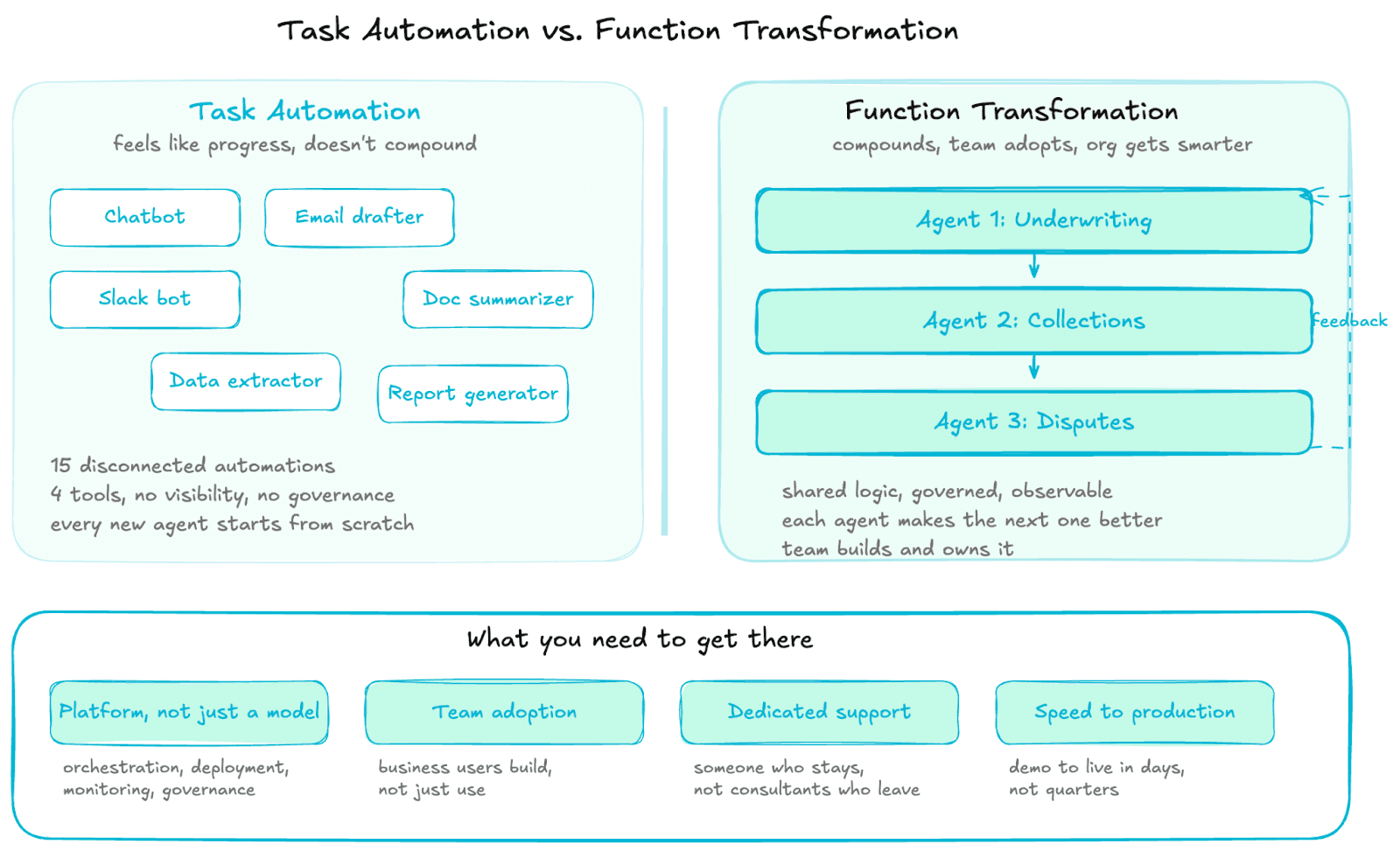 The fix: function transformation. Rebuild entire functions on one platform where agents share data, governance, and real-time signals.
