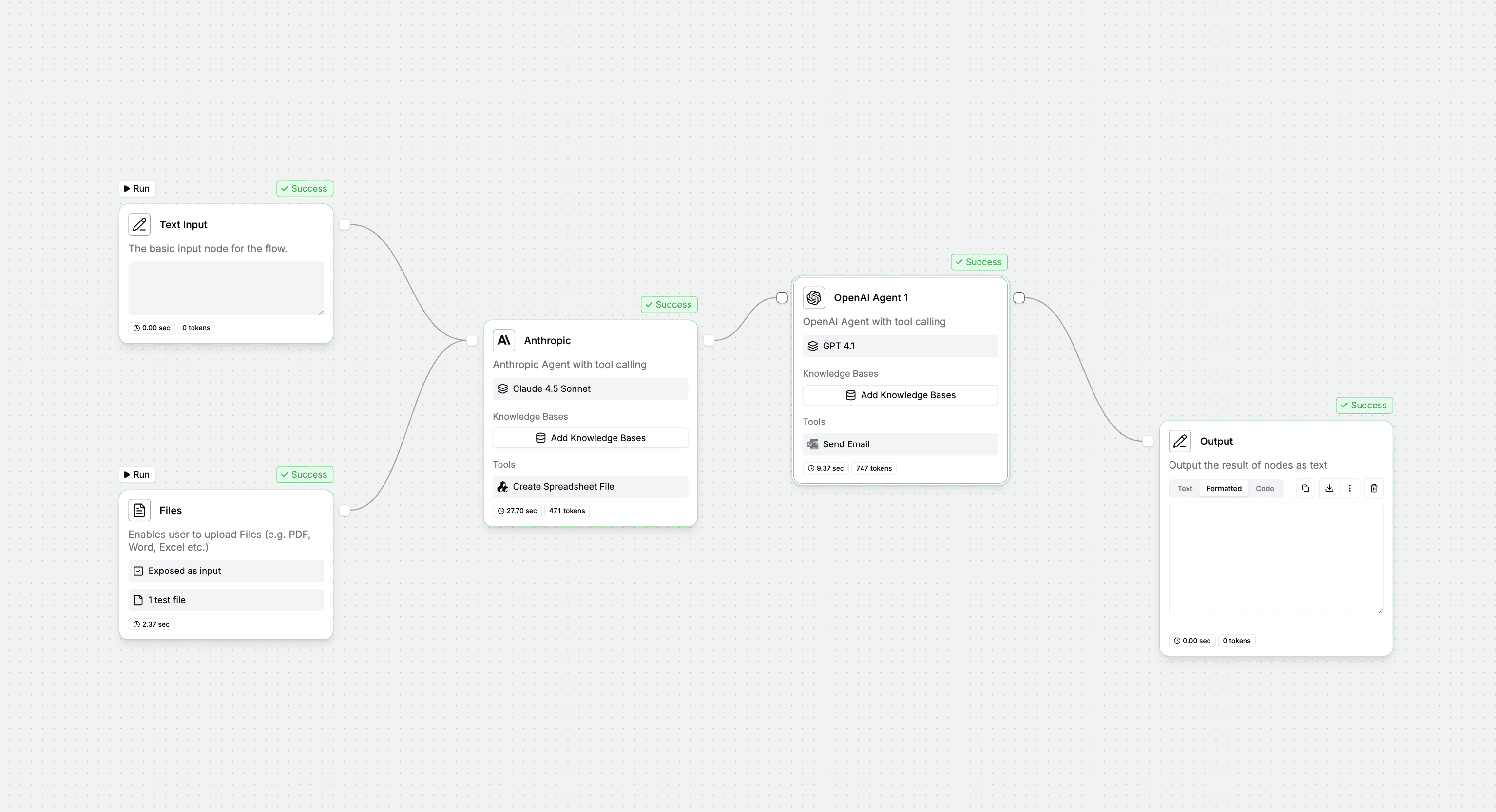 This agent automates the process of answering customer questions by combining company knowledge base files and website content, delivering fast, reliable responses.