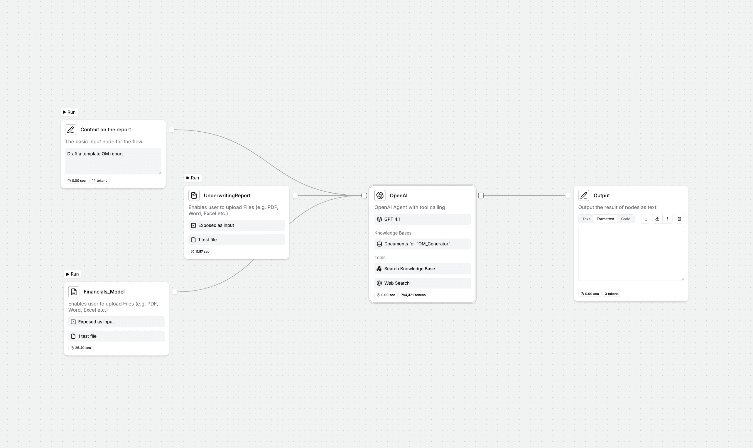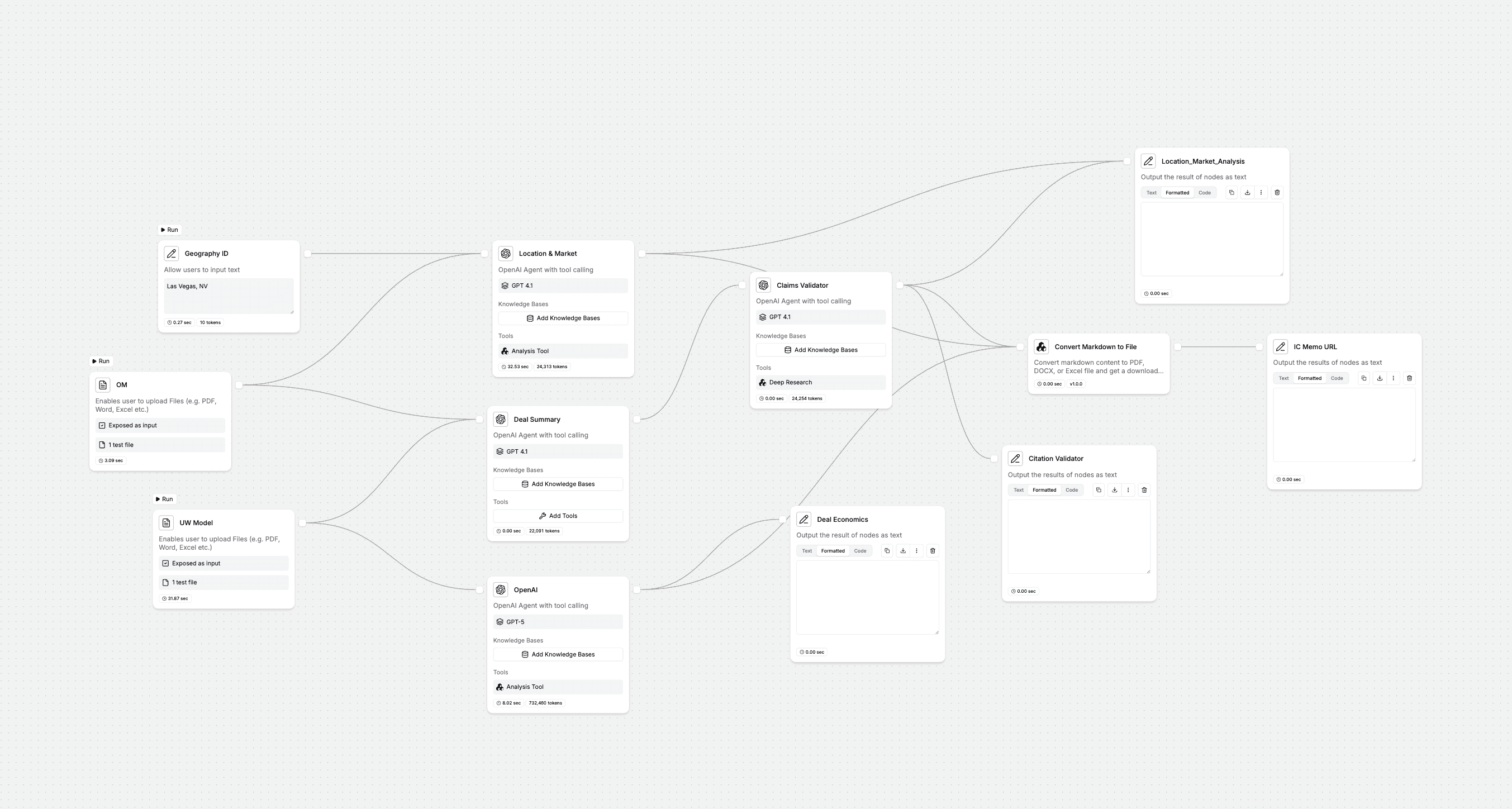 An AI-powered real estate investment analysis workflow that processes offering memorandums and underwriting models to automatically generate location & market analysis, deal economics summaries, claim validation reports, and a formatted investment memo.